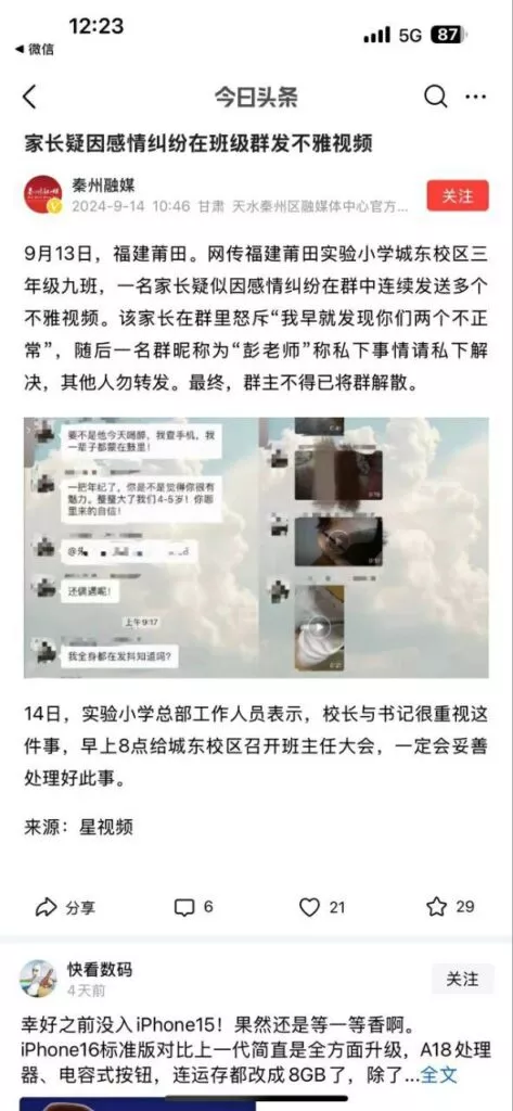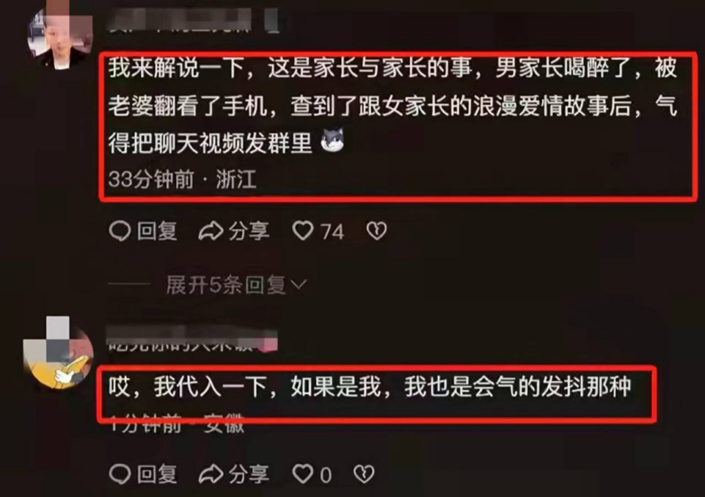 福建莆田实验小学城东校区三年级九班,一名家长疑似因感情纠纷在群中连续发送多个不雅视频。这位家长曝料早就怀疑自己的丈夫在外乱搞男女关系出轨,但一直苦于没有证据。但丈夫醉酒后,终于被这位家长解锁了手机看到了所有证据。