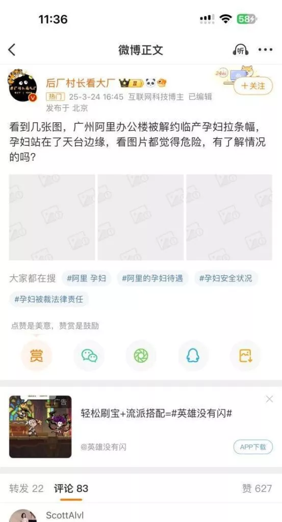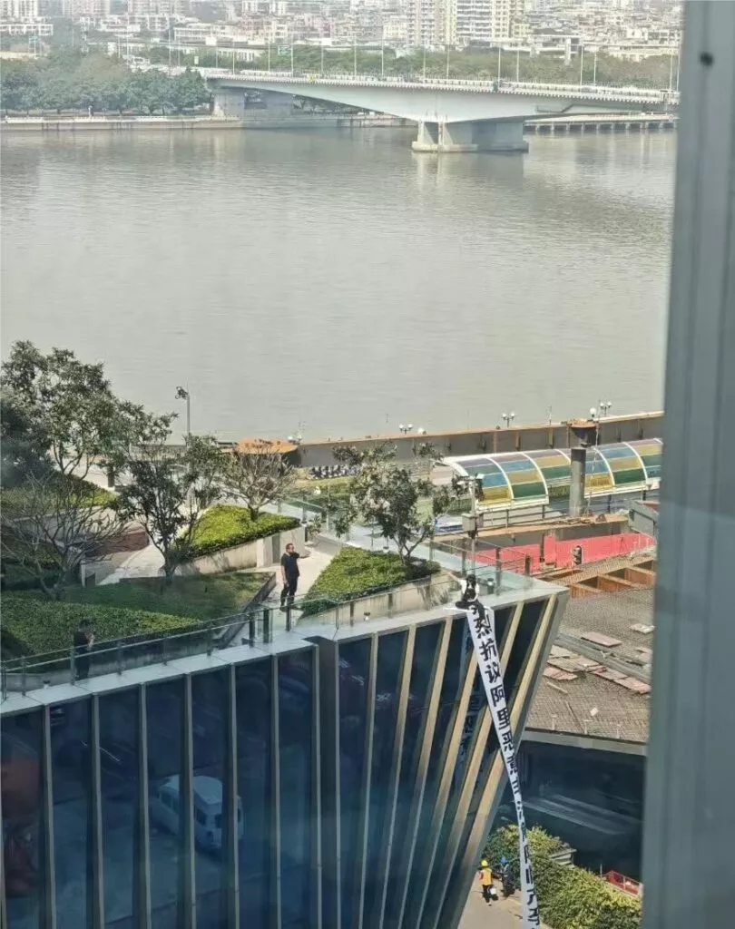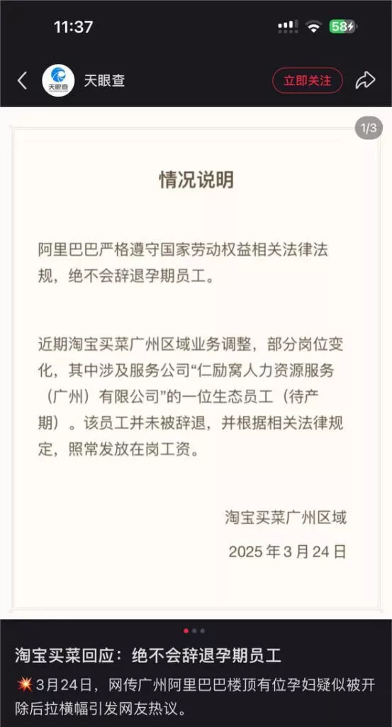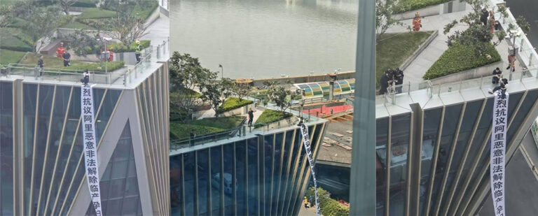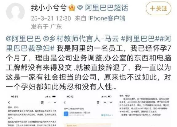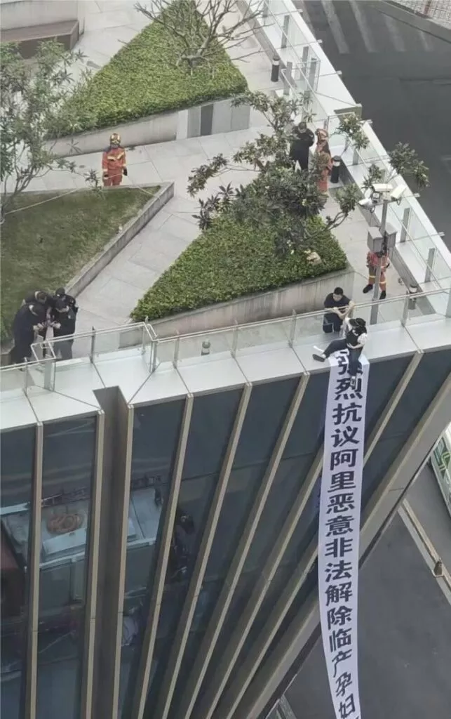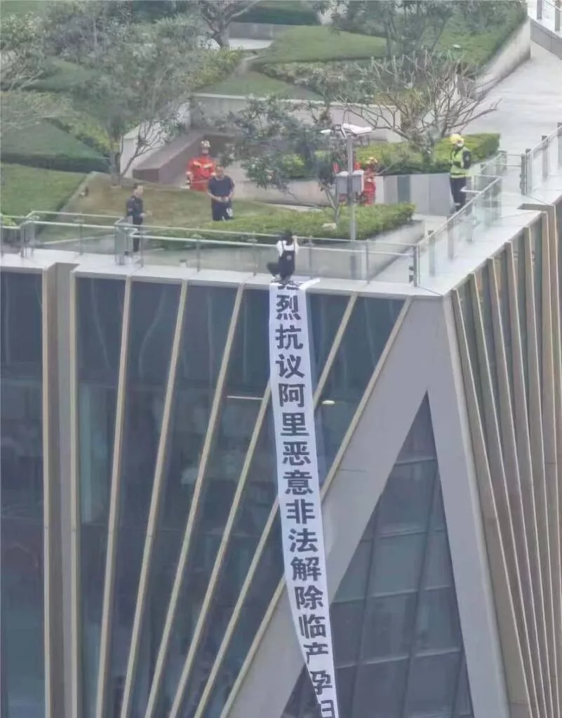 广州阿里巴巴近日爆出丑闻,一名孕妇登上阿里巴巴大楼的楼顶,悬挂横幅控诉公司非法解雇员工。她因怀孕而被公司强制解除劳动关系,因此选择在楼顶拉横幅曝光此事。