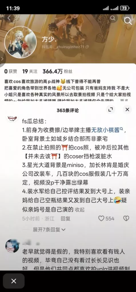 366万粉丝顶级富家大小姐方少,喜欢cosplay喜欢二次元,常展示自己的豪华别墅和出入高端场所,营造富家小姐形象,近日被石锤各种造假后,更是被扒出早期就是一名福利姬,借抖音流量成功上岸后,开始了造假之路