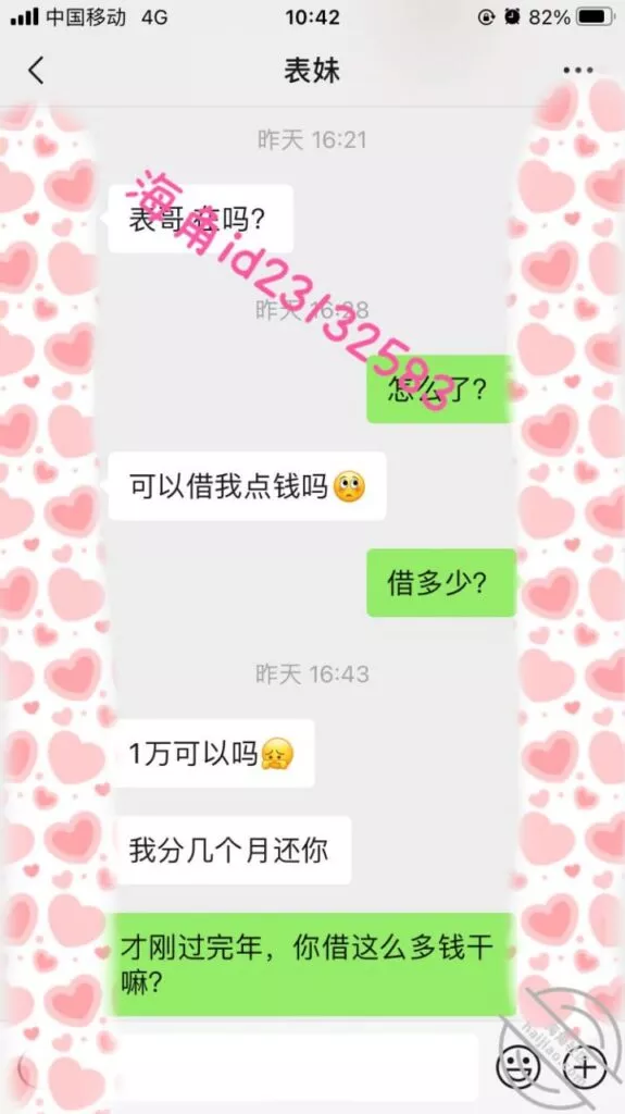 2020年的时候表妹找我借了1000块,我很爽快的给了,可能是这个原因她现在会想到找我再借钱