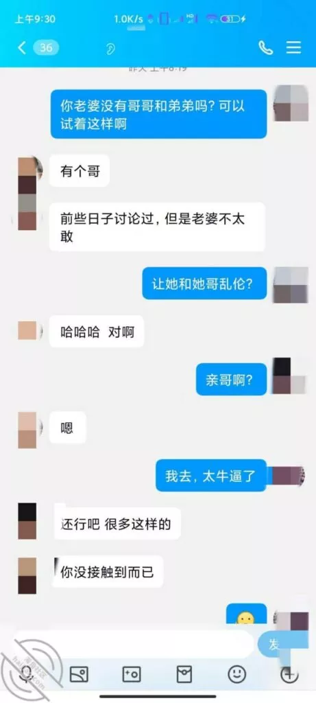 有没有想过错乱关系,妹夫说:身边的同事,发小都Cao过妹妹。看来妹妹是可以接受身边人来Cao她的。更震惊的是,妹夫居然想让我爸Cao她的亲闺女!难怪妹妹回家都穿那么搔的内裤,应该是想吸引老爸!但是妹妹抗拒没想尝试,哈哈哈哈,也不知道我爸有没有机会尝尝自己亲闺女的搔B。给大家附上聊天记录,同时帮小弟想想出出主意,我决定等他们回来娘家的时候和妹夫当面坦白,给妹夫看我俩的聊天记录,告诉他是我在和他们聊,不知道是否可行,大神们给点建议啊,还是说我继续这么聊下去,等到见面的时候给他们个惊喜?兄弟们,如果可以成功,我会一直给大家更新我们的情况和视频的!如果我能带着妹妹3p也不会忘记大家的哈!大家多多帮忙出出意见!跪求!
