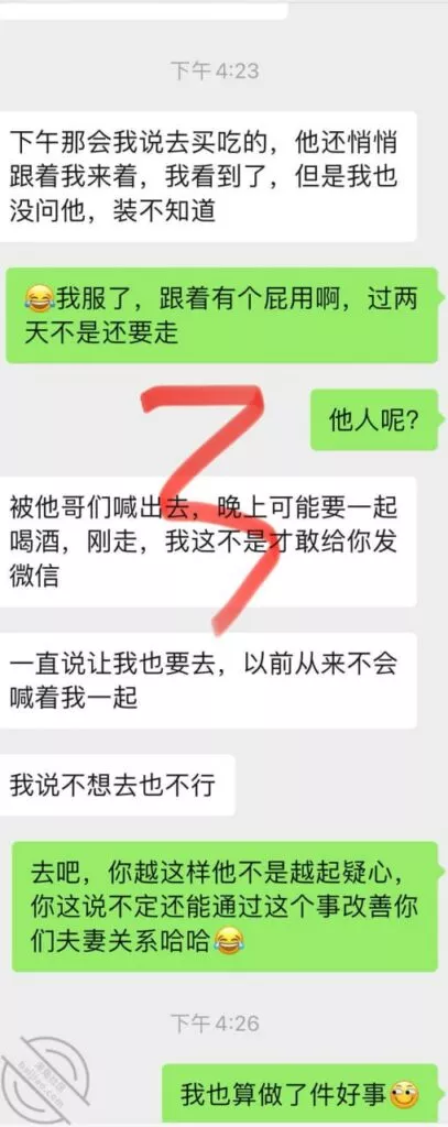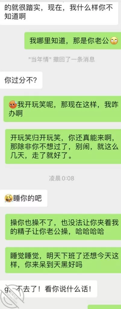 兄弟们差点出了大事啊,差点被他老公发现,幸好我们俩还都算机灵,然后她老公不算太机灵,不然可就惨了,后果不堪设想;事情是这样的,昨天她不是大早晨天刚亮就来找我Cao了一下吗,结果回去的时候她老公已经醒了,问题是她穿着睡衣出来的啊,我知道不管她怎么解释,她老公肯定是不会相信她的,现在心里肯定已经是怀疑她有人的,而且但凡有点脑子都能想到这个人肯定离得很近;先发聊天记录给大家看吧:以上就是昨天下午我俩的聊天记录了,本来昨天要发,结果呢临时有事情我要出去,才有时间登陆,兄弟们自己看吧;居然还跟踪她,这人脑子也是似乎有点不大够用,这种情况下跟踪能跟踪出个毛线啊,换了我,肯定装不知道啊,手机也不应该去查,就完全装不知道,完全相信她,叫她放松警惕,回头那不是一跟一个准啊,不过也算躲过一劫,真的要是被她老公知道我家地址,换了你们,会不会来敲门?这几天Cao不了了,还是暂且低调点吧,安全为主啊!也不知道这人啥时候走,我问她她也不知道,正好就当休息一下了。